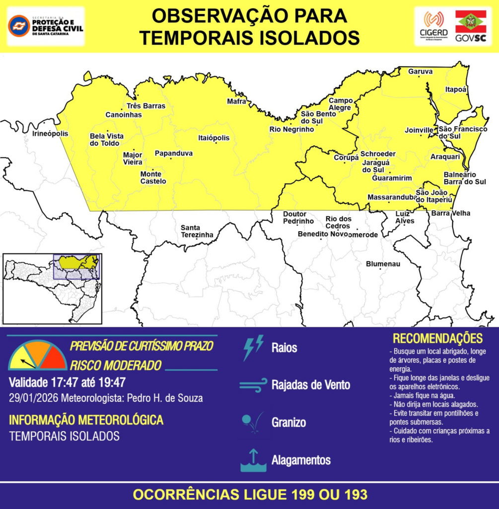 OBSERVAÇÃO – 29/01 17:47 – TEMPORAIS ISOLADOS com RAIOS, RAJADAS DE VENTO, GRANIZO e ALAGAMENTOS pontuais para áreas das regiões do Planalto Norte, Litoral Norte, Baixo e Médio Vale do Itajaí nas próximas 2 horas.