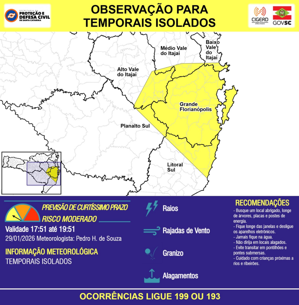 OBSERVAÇÃO – 29/01 17:51 – TEMPORAIS ISOLADOS com RAIOS, RAJADAS DE VENTO, GRANIZO e ALAGAMENTOS pontuais para áreas das regiões do Planalto Sul, Litoral Sul, Grande Florianópolis, Baixo, Médio e Alto Vale do Itajaí nas próximas 2 horas.
