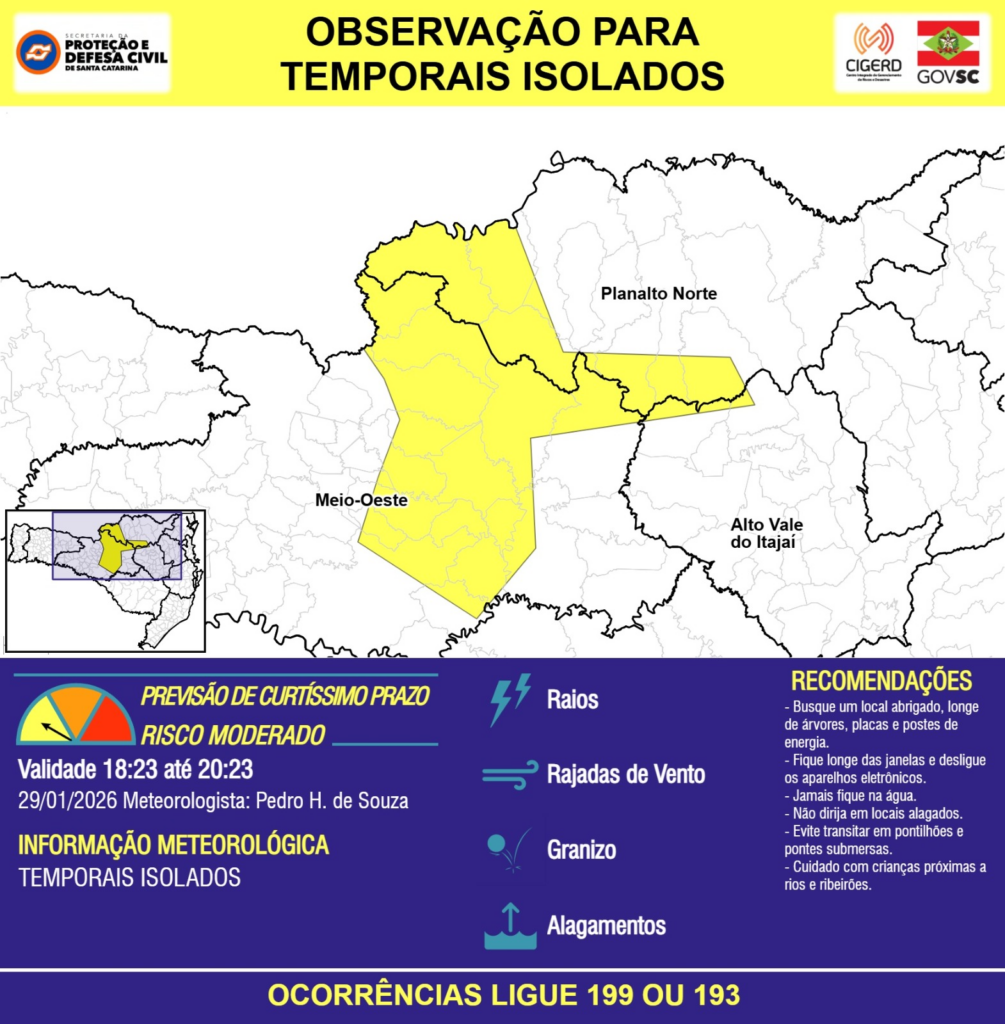 OBSERVAÇÃO – 29/01 18:23 – TEMPORAIS ISOLADOS com RAIOS, RAJADAS DE VENTO, GRANIZO e ALAGAMENTOS pontuais para áreas das regiões do Meio-Oeste, Planalto Norte e Alto Vale do Itajaí nas próximas 2 horas. Ocorrências ligue 199 ou 193.