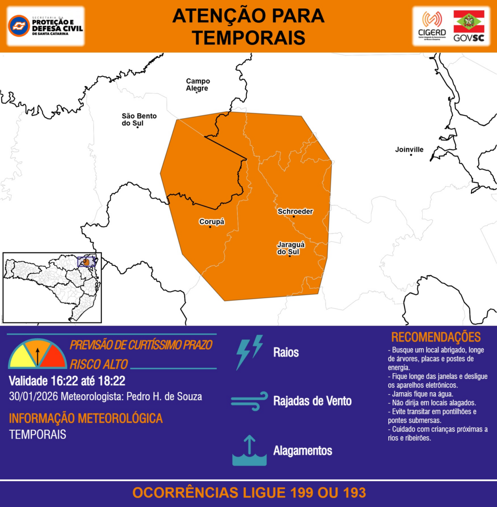 ATENÇÃO – 30/01 16:22 – TEMPORAIS com RAIOS, RAJADAS DE VENTO e ALAGAMENTOS para os municípios de Campo Alegre, Corupá, Jaraguá do Sul, Joinville, Schroeder e São Bento do Sul nas próximas 2 horas. Ocorrências ligue 199 ou 193.