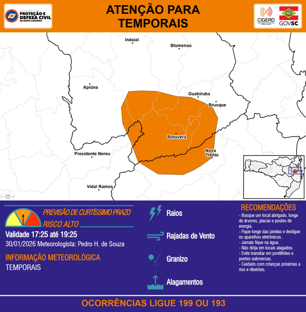 ATENÇÃO – 30/01 17:25 – TEMPORAIS com RAIOS, RAJADAS DE VENTO, GRANIZO e ALAGAMENTOS para os municípios de Apiúna, Blumenau, Botuverá, Brusque, Guabiruba, Indaial, Nova Trento, Presidente Nereu e Vidal Ramos nas próximas 2 horas. Ocorrências ligue 199 ou 193.