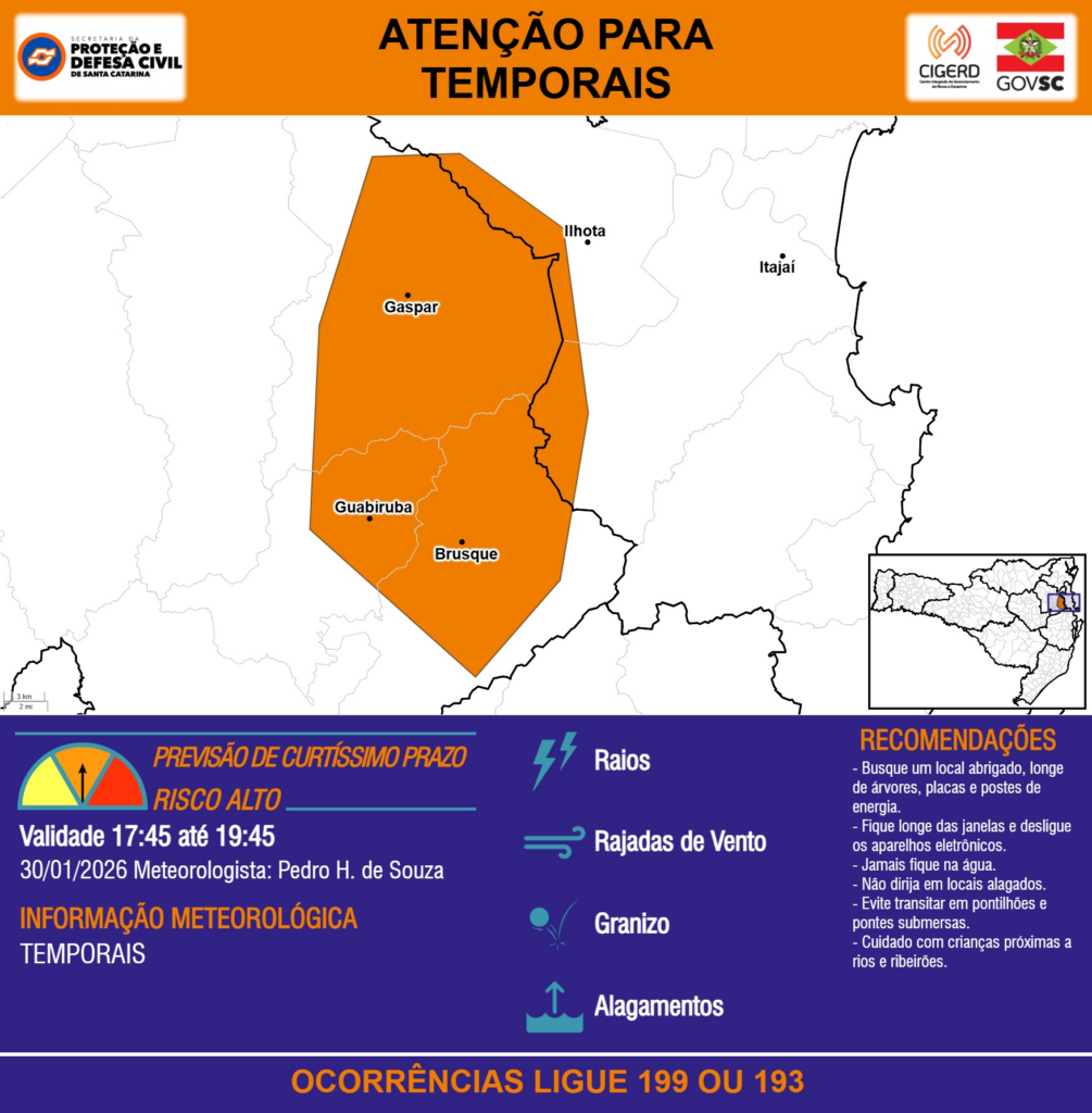 ATENÇÃO – 30/01 17:45 – TEMPORAIS com RAIOS, RAJADAS DE VENTO, GRANIZO e ALAGAMENTOS para áreas dos municípios de Brusque, Gaspar, Guabiruba, Ilhota e Itajaí nas próximas 2 horas. Ocorrências ligue 199 ou 193.