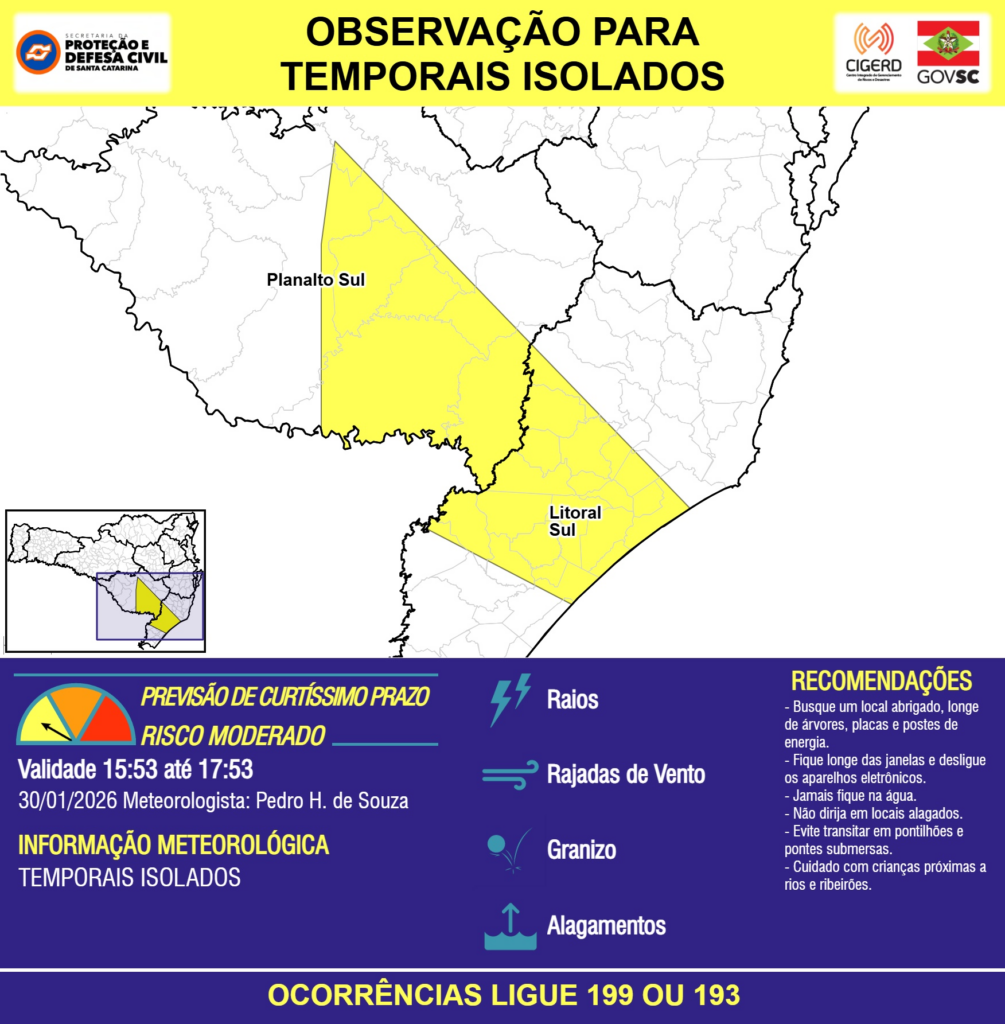 OBSERVAÇÃO – 30/01 15:53 – TEMPORAIS ISOLADOS com RAIOS, RAJADAS DE VENTO, GRANIZO e ALAGAMENTOS pontuais para áreas das regiões do Planalto Sul e Litoral Sul nas próximas 2 horas. Ocorrências ligue 199 ou 193.