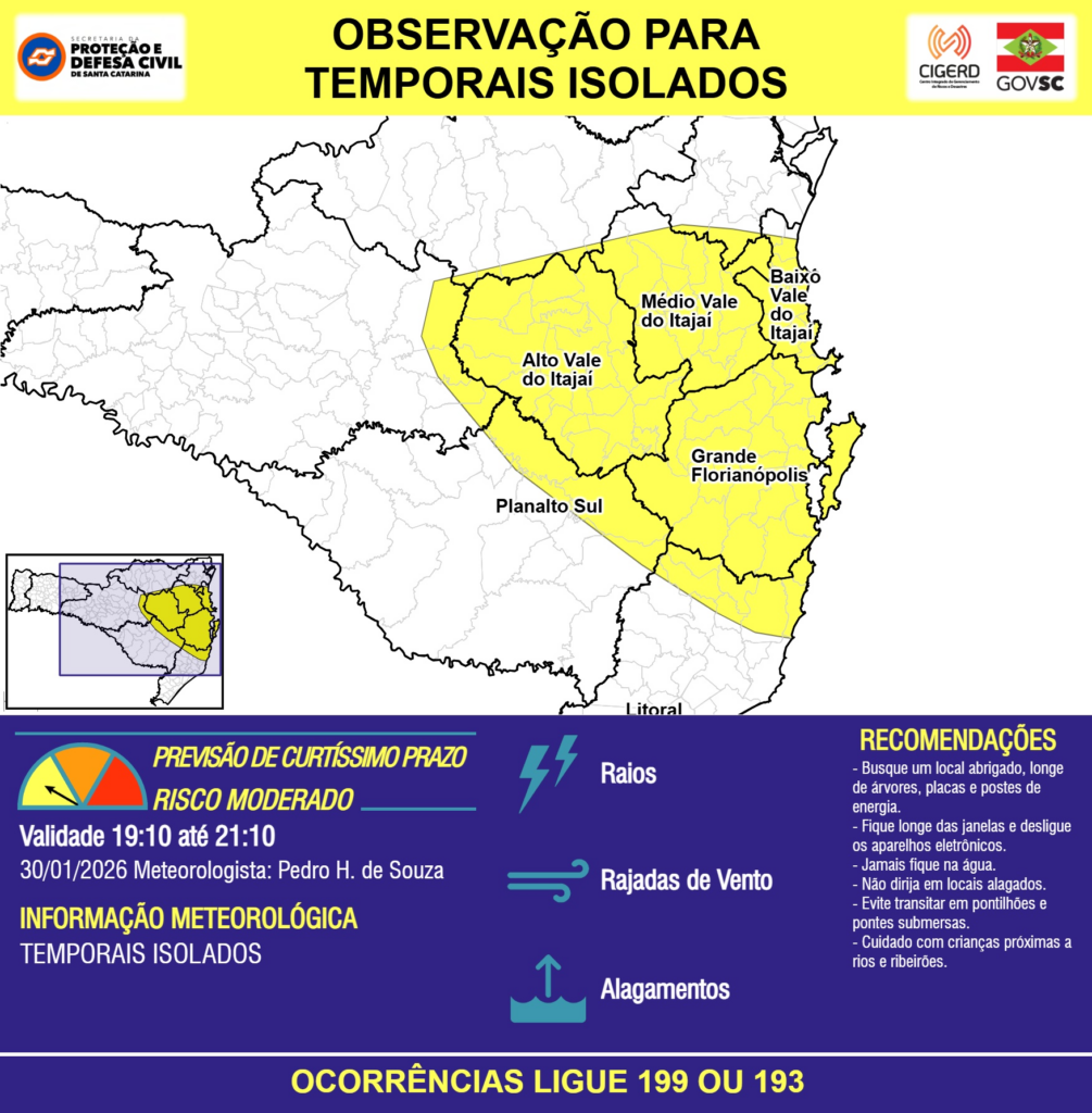 OBSERVAÇÃO – 30/01 19:10 – TEMPORAIS ISOLADOS com RAIOS, RAJADAS DE VENTO e ALAGAMENTOS pontuais para áreas das regiões do Planalto Sul, Litoral Sul, Grande Florianópolis, Baixo, Médio e Alto Vale do Itajaí nas próximas 2 horas. Ocorrências ligue 199 ou 193.