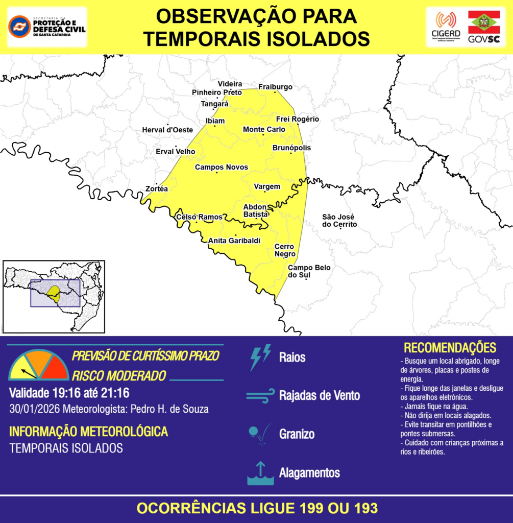 OBSERVAÇÃO – 30/01 19:16 – TEMPORAIS ISOLADOS com RAIOS, RAJADAS DE VENTO, GRANIZO e ALAGAMENTOS pontuais para áreas das regiões do Meio-Oeste e Planalto Sul nas próximas 2 horas. Ocorrências ligue 199 ou 193.