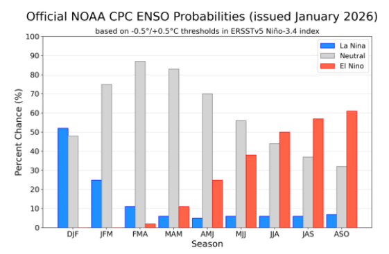 Figura 1: Previsão probabilística do fenômeno El Niño – Oscilação Sul nos próximos trimestres. Fonte: Climate Prediction Center (CPC).