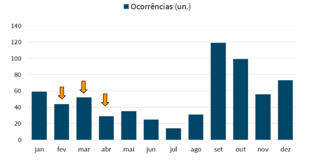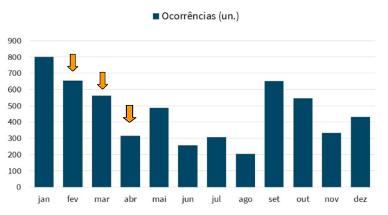 O trimestre composto por fevereiro, março e abril reúne uma parcela expressiva das ocorrências registradas ao longo do ano. Observa-se, no entanto, uma redução gradual desses eventos ao longo do período, com destaque para o mês de abril, que apresenta uma diminuição significativa no número de ocorrências após três meses consecutivos de registros elevados.