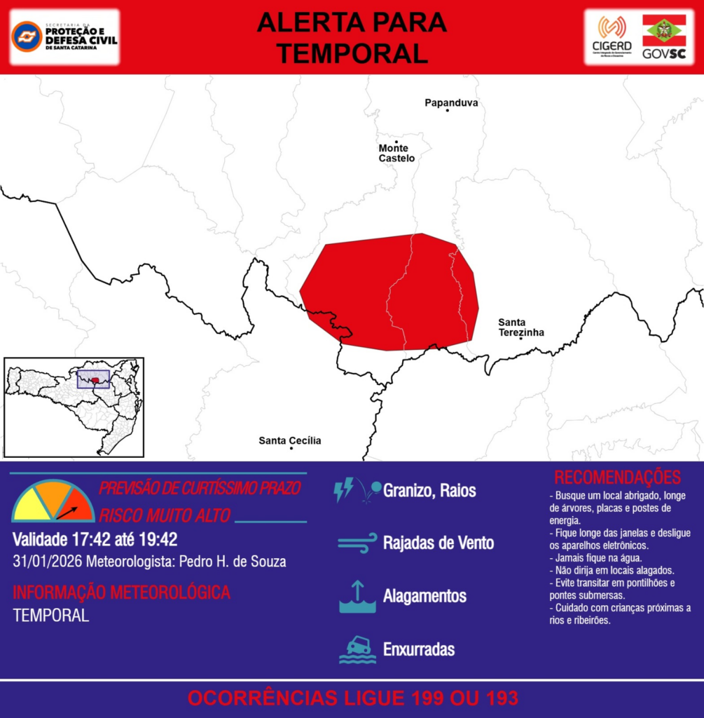 ALERTA – 31/01 17:42 – TEMPORAL com RAJADAS DE VENTO, ALAGAMENTOS, GRANIZO, RAIOS e risco de ENXURRADAS para áreas dos municípios de Monte Castelo, Papanduva, Santa Cecília e Santa Terezinha nas próximas 2 horas. Ocorrências ligue 199 ou 193.