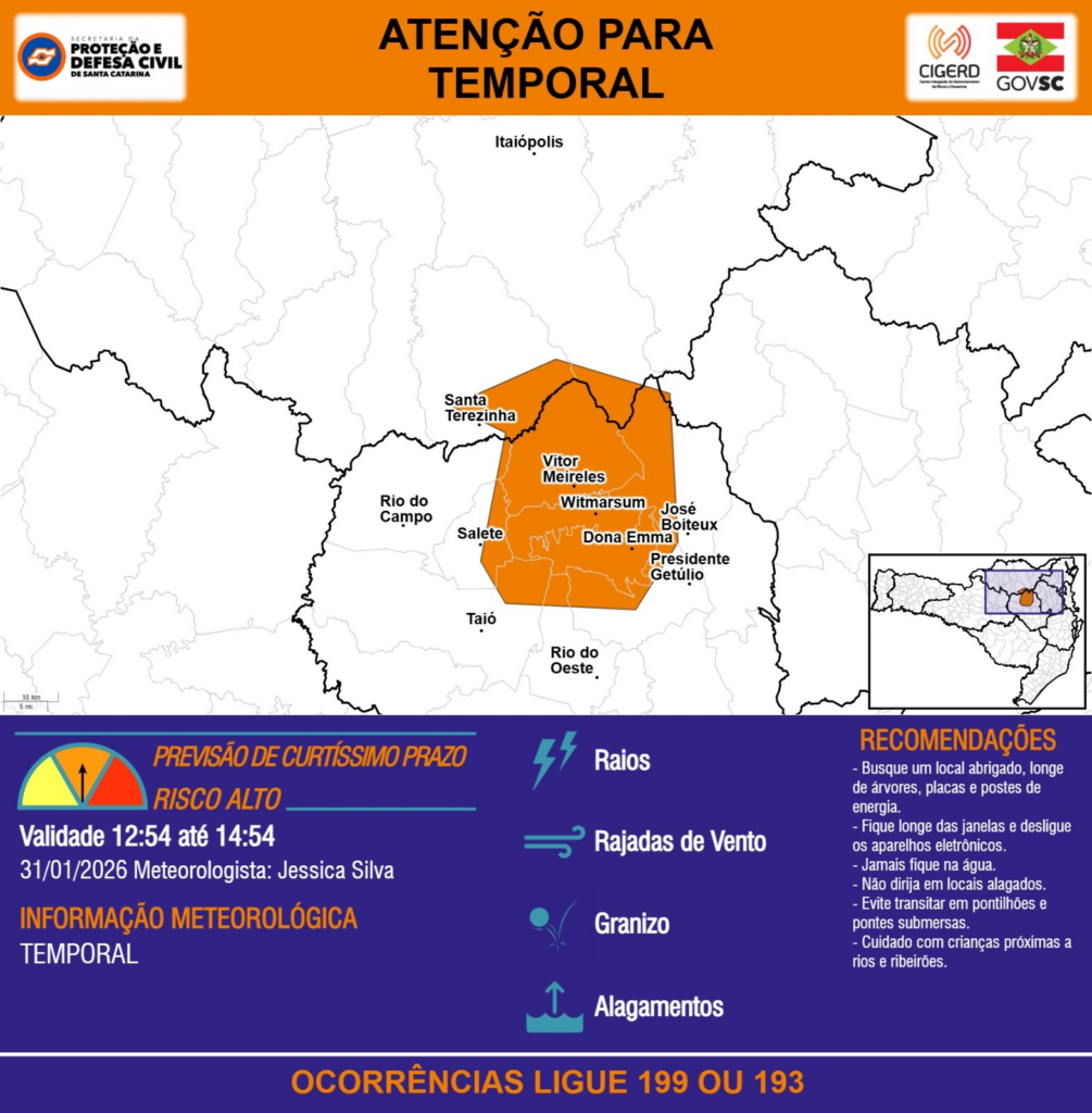 ATENÇÃO – 31/01 12:54 – TEMPORAL com RAIOS, RAJADAS DE VENTO, GRANIZO e ALAGAMENTOS para os municípios de Dona Emma, Itaiópolis, José Boiteux, Presidente Getúlio, Rio do Campo, Rio do Oeste, Salete, Santa Terezinha, Taió, Vitor Meireles e Witmarsum nas próximas 2 horas. Ocorrências ligue 199 ou 193.
