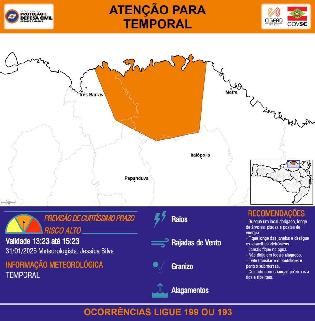 ATENÇÃO – 31/01 13:23 – TEMPORAL com RAIOS, RAJADAS DE VENTO, GRANIZO e ALAGAMENTOS para os municípios de Itaiópolis, Mafra, Papanduva e Três Barras nas próximas 2 horas. Ocorrências ligue 199 ou 193.