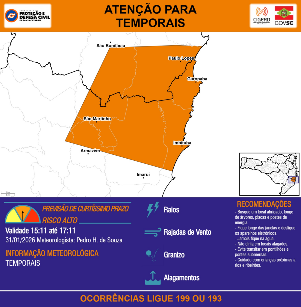 ATENÇÃO – 31/01 15:11 – TEMPORAIS com RAIOS, RAJADAS DE VENTO, GRANIZO e ALAGAMENTOS para áreas dos municípios de Armazém, Garopaba, Imaruí, Imbituba, Paulo Lopes, São Bonifácio e São Martinho nas próximas 2 horas. Ocorrências ligue 199 ou 193.