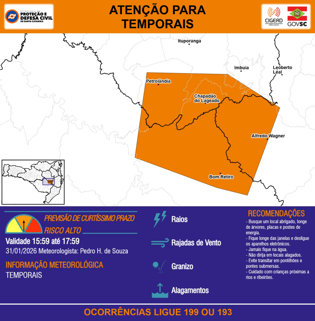 ATENÇÃO – 31/01 15:59 – TEMPORAIS com RAIOS, RAJADAS DE VENTO, GRANIZO e ALAGAMENTOS para áreas dos municípios de Alfredo Wagner, Bom Retiro, Chapadão do Lageado, Imbuia, Ituporanga, Leoberto Leal e Petrolândia nas próximas 2 horas. Ocorrências ligue 199 ou 193.