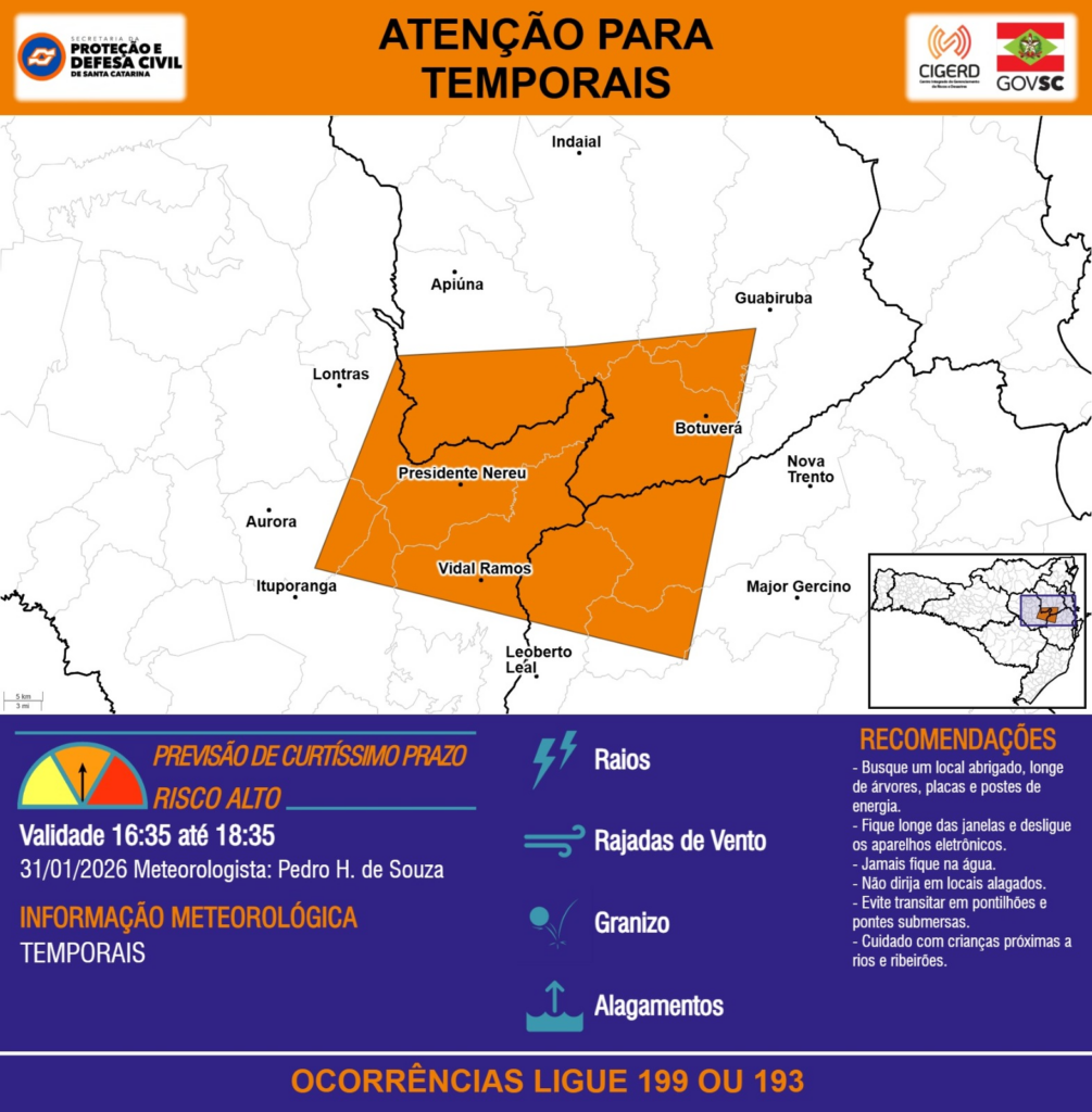 ATENÇÃO – 31/01 16:35 – TEMPORAIS com RAIOS, RAJADAS DE VENTO, GRANIZO e ALAGAMENTOS para áreas dos municípios de Apiúna, Aurora, Botuverá, Guabiruba, Indaial, Ituporanga, Leoberto Leal, Lontras, Major Gercino, Nova Trento, Presidente Nereu e Vidal Ramos nas próximas 2 horas. Ocorrências ligue 199 ou 193.