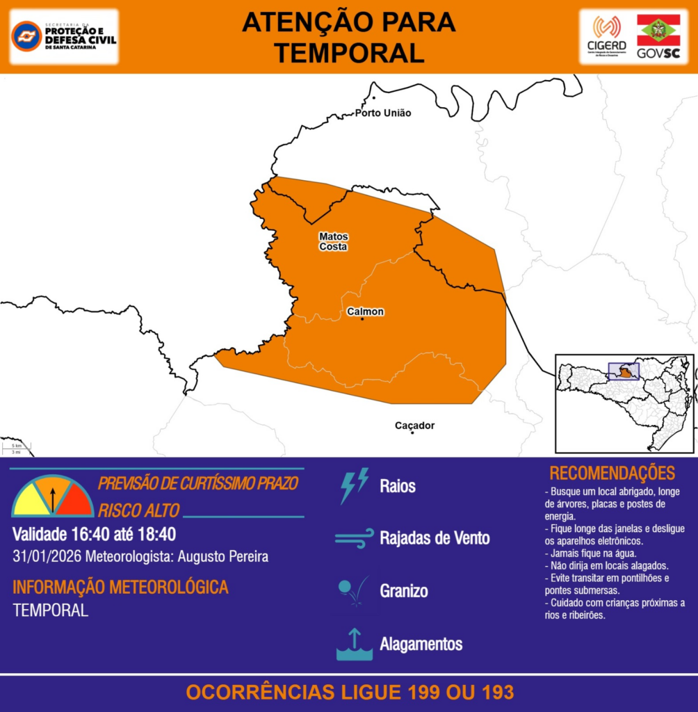 ATENÇÃO – 31/01 16:40 – TEMPORAL com RAIOS, RAJADAS DE VENTO, GRANIZO e ALAGAMENTOS para as regiões do Meio-Oeste e Planalto Norte nas próximas 2 horas. Ocorrências ligue 199 ou 193.