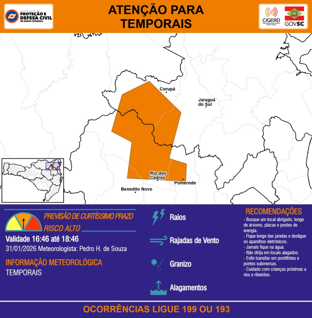 ATENÇÃO – 31/01 16:46 – TEMPORAIS com RAIOS, RAJADAS DE VENTO, GRANIZO e ALAGAMENTOS para áreas dos municípios de Benedito Novo, Corupá, Jaraguá do Sul, Pomerode e Rio dos Cedros nas próximas 2 horas. Ocorrências ligue 199 ou 193.