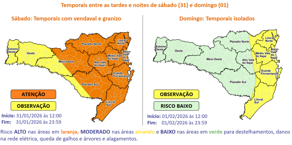 Neste sábado (31), o dia será marcado por condições típicas de verão em Santa Catarina: tempo firme, ensolarado, temperaturas em elevação e temporais a partir do período da tarde. Porém, as instabilidades serão reforçadas pela circulação dos ventos associados à atuação de um ciclone extratropical em alto mar, distante da costa catarinense. O risco é moderado a alto para ocorrências associadas a destelhamentos, danos na rede elétrica, queda de galhos e árvores e algamentos, especialmente do Meio-Oeste ao Litoral.
