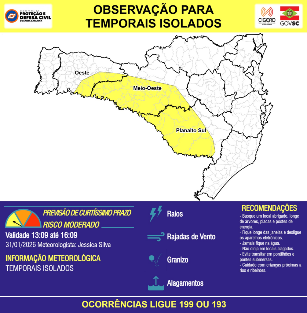 OBSERVAÇÃO – 31/01 13:09 – TEMPORAIS ISOLADOS com RAIOS, RAJADAS DE VENTO, GRANIZO e ALAGAMENTOS pontuais para as regiões do Oeste, Meio-Oeste e Planalto Sul nas próximas 3 horas. Ocorrências ligue 199 ou 193.