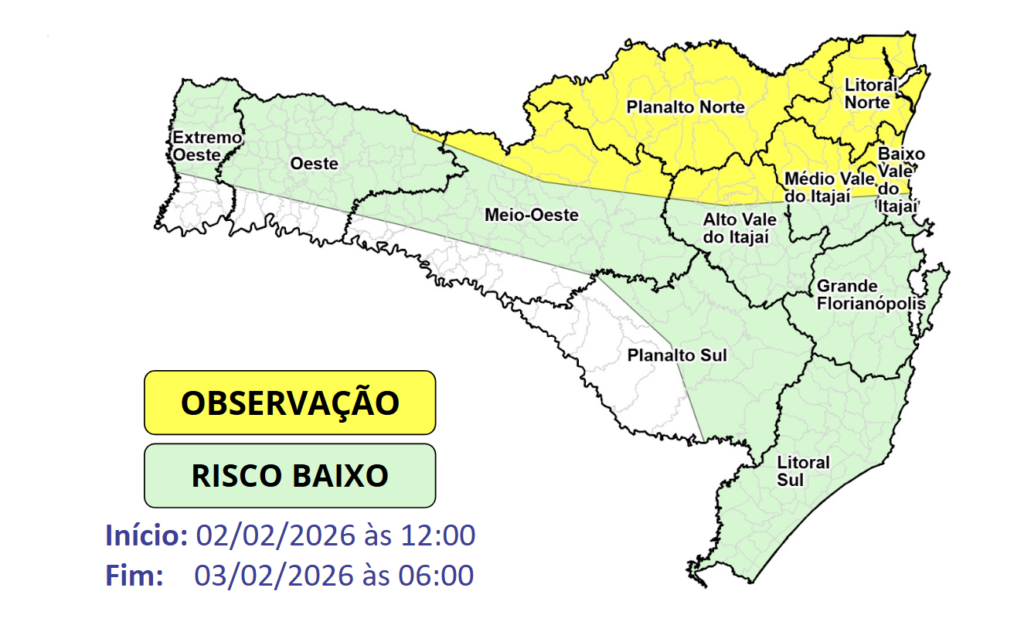Nesta segunda-feira (02), a combinação do calor, umidade e uma baixa pressão no interior do continente, favorece a formação de temporais isolados no estado, especialmente no Norte catarinense. O risco é baixo a moderado para ocorrências associadas a alagamentos, destelhamentos, danos na rede elétrica, queda de galhos e árvores e destelhamentos.