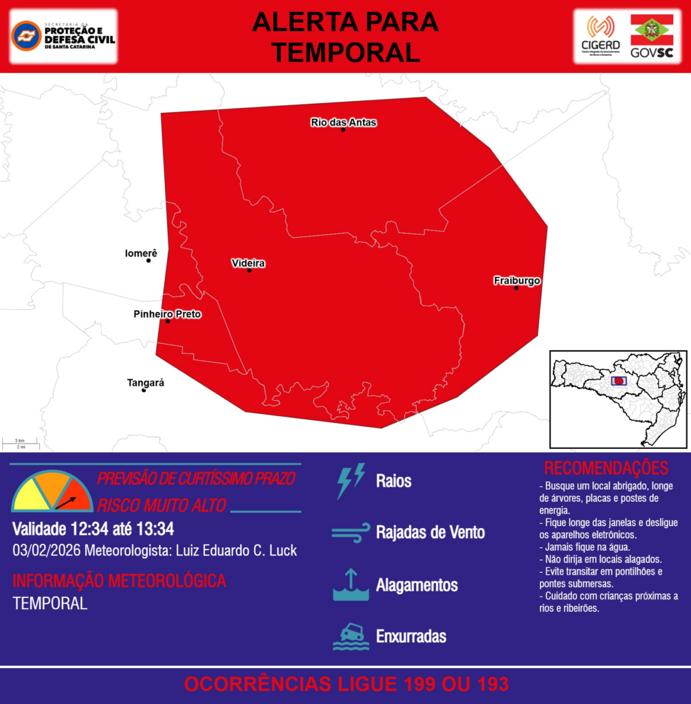 ALERTA – 03/02 12:34 – TEMPORAL com RAIOS, RAJADAS DE VENTO, ALAGAMENTOS e risco de ENXURRADAS para os municípios de Fraiburgo, Iomerê, Pinheiro Preto, Rio das Antas, Tangará e Videira na próxima hora. Ocorrências ligue 199 ou 193.