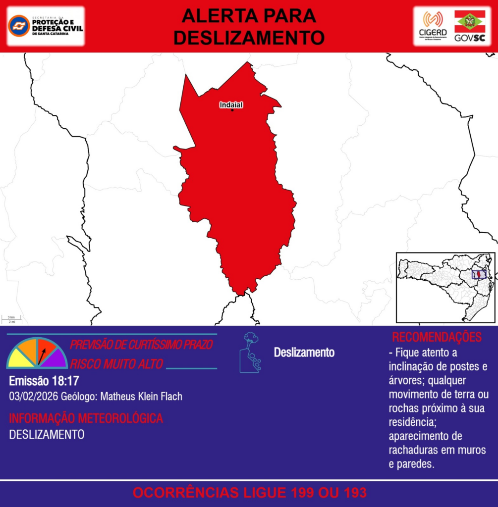 ALERTA – 03/02 18:17 – DESLIZAMENTO para o município de Indaial. Ocorrências ligue 199 ou 193.