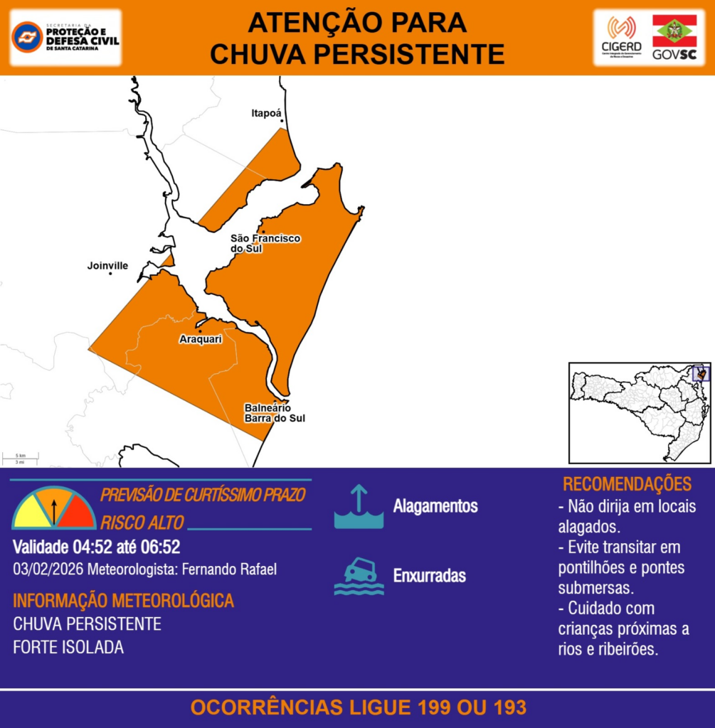 ATENÇÃO – 03/02 04:52 – CHUVA PERSISTENTE de intensidade forte isolada com ALAGAMENTOS e risco de ENXURRADAS para os municípios de Araquari, Balneário Barra do Sul, Itapoá, Joinville e São Francisco do Sul nas próximas 2 horas. Ocorrências ligue 199 ou 193.