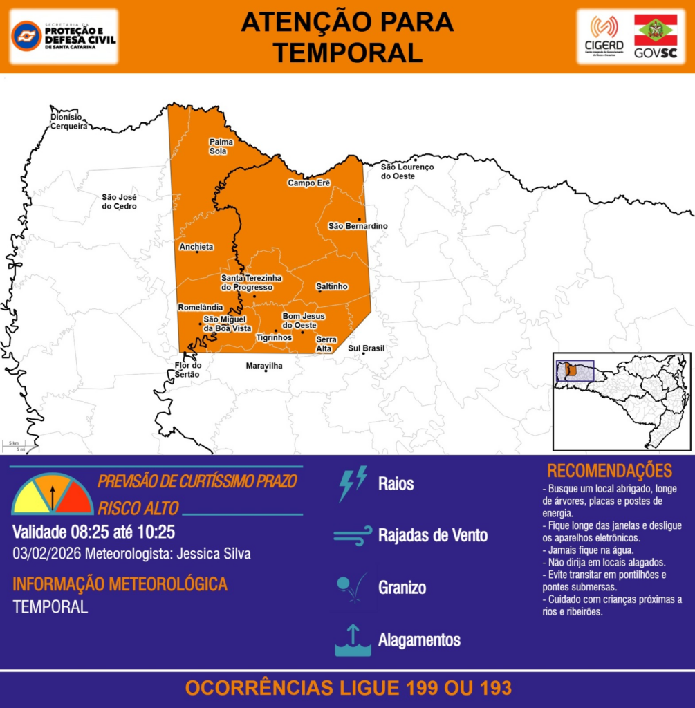 ATENÇÃO – 03/02 08:25 – TEMPORAL com RAIOS, RAJADAS DE VENTO, GRANIZO e ALAGAMENTOS para os municípios de Anchieta, Bom Jesus do Oeste, Campo Erê, Dionísio Cerqueira, Flor do Sertão, Maravilha, Palma Sola, Romelândia, Saltinho, Santa Terezinha do Progresso, Serra Alta, Sul Brasil, São Bernardino, São José do Cedro, São Lourenço do Oeste, São Miguel da Boa Vista e Tigrinhos nas próximas 2 horas. Ocorrências ligue 199 ou 193.