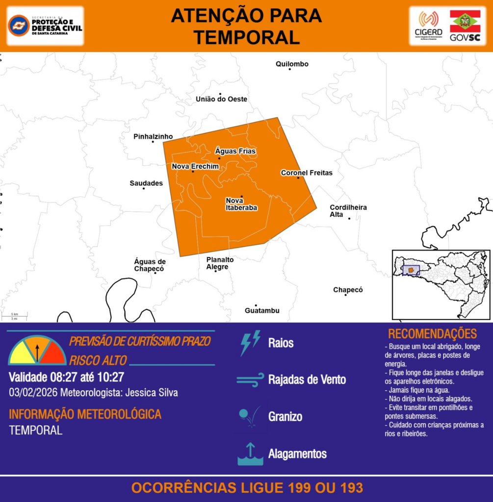 ATENÇÃO – 03/02 08:27 – TEMPORAL com RAIOS, RAJADAS DE VENTO, GRANIZO e ALAGAMENTOS para os municípios de Chapecó, Cordilheira Alta, Coronel Freitas, Guatambu, Nova Erechim, Nova Itaberaba, Pinhalzinho, Planalto Alegre, Quilombo, Saudades, União do Oeste, Águas Frias e Águas de Chapecó nas próximas 2 horas. Ocorrências ligue 199 ou 193.
