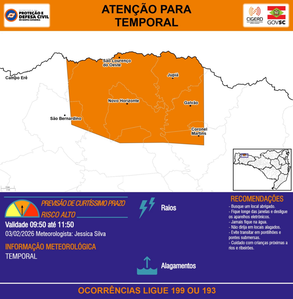 ATENÇÃO – 03/02 09:50 – TEMPORAL com RAIOS e ALAGAMENTOS para os municípios de Campo Erê, Coronel Martins, Galvão, Jupiá, Novo Horizonte, São Bernardino e São Lourenço do Oeste nas próximas 2 horas. Ocorrências ligue 199 ou 193.