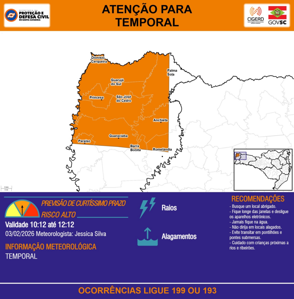 ATENÇÃO – 03/02 10:12 – TEMPORAL com RAIOS e ALAGAMENTOS para os municípios de Anchieta, Barra Bonita, Dionísio Cerqueira, Guaraciaba, Guarujá do Sul, Palma Sola, Paraíso, Princesa, Romelândia e São José do Cedro nas próximas 2 horas. Ocorrências ligue 199 ou 193.