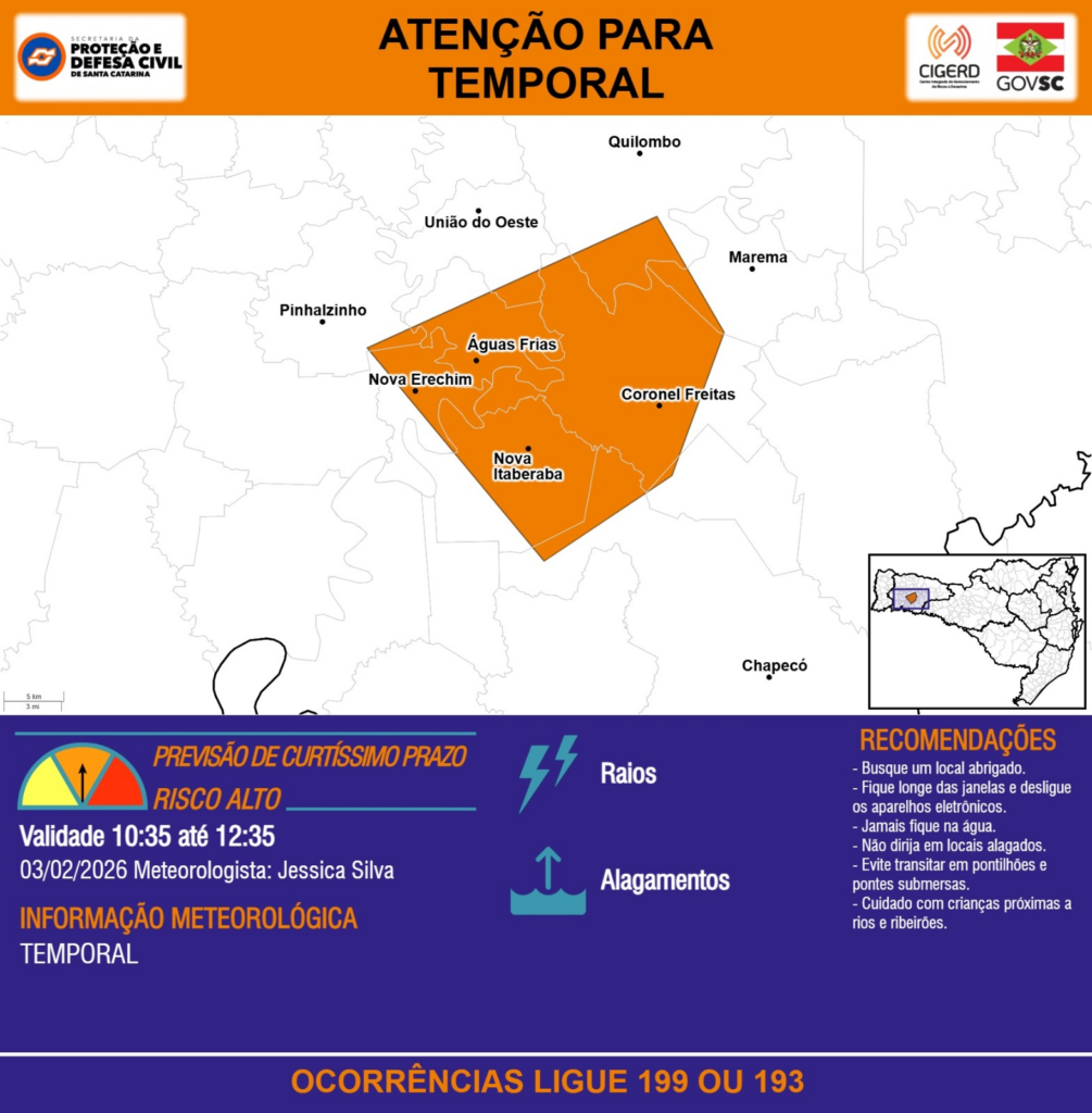 ATENÇÃO – 03/02 10:35 – TEMPORAL com RAIOS e ALAGAMENTOS para os municípios de Chapecó, Coronel Freitas, Marema, Nova Erechim, Nova Itaberaba, Pinhalzinho, Quilombo, União do Oeste e Águas Frias nas próximas 2 horas. Ocorrências ligue 199 ou 193.