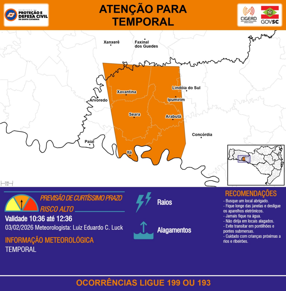 ATENÇÃO – 03/02 10:36 – TEMPORAL com RAIOS e ALAGAMENTOS para os municípios de Arabutã, Arvoredo, Concórdia, Faxinal dos Guedes, Ipumirim, Itá, Lindóia do Sul, Seara, Xanxerê e Xavantina nas próximas 2 horas. Ocorrências ligue 199 ou 193.