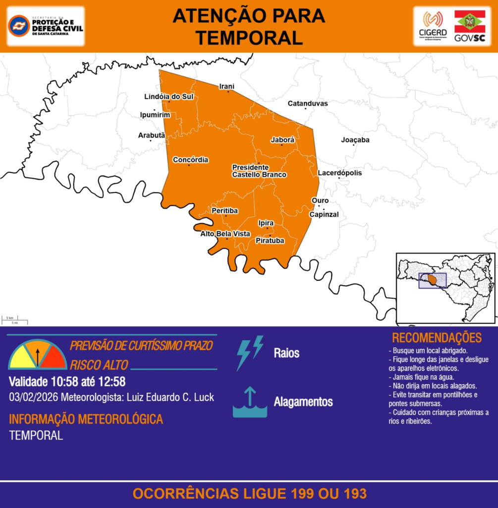 ATENÇÃO – 03/02 10:58 – TEMPORAL com RAIOS e ALAGAMENTOS para os municípios de Alto Bela Vista, Arabutã, Capinzal, Catanduvas, Concórdia, Ipira, Ipumirim, Irani, Jaborá, Joaçaba, Lacerdópolis, Lindóia do Sul, Ouro, Peritiba, Piratuba e Presidente Castello Branco nas próximas 2 horas. Ocorrências ligue 199 ou 193.