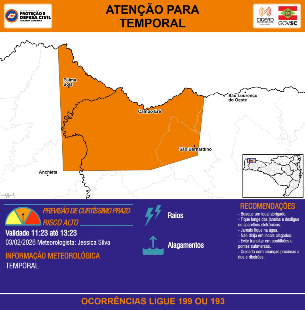 ATENÇÃO – 03/02 11:23 – TEMPORAL com RAIOS e ALAGAMENTOS para os municípios de Anchieta, Campo Erê, Palma Sola, São Bernardino e São Lourenço do Oeste nas próximas 2 horas. Ocorrências ligue 199 ou 193.
