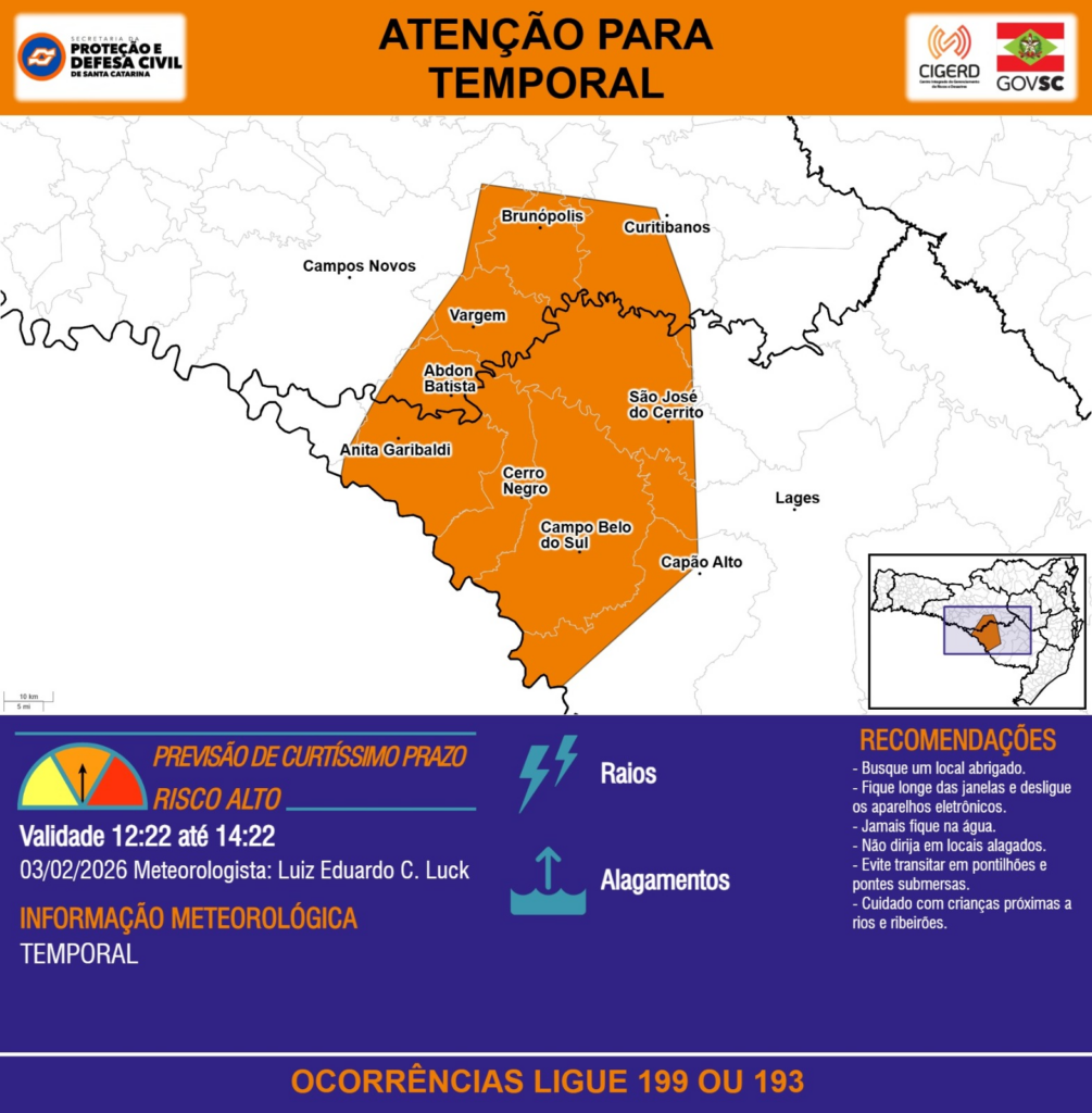 ATENÇÃO – 03/02 12:22 – TEMPORAL com RAIOS e ALAGAMENTOS para os municípios de Abdon Batista, Anita Garibaldi, Brunópolis, Campo Belo do Sul, Campos Novos, Capão Alto, Cerro Negro, Curitibanos, Lages, São José do Cerrito e Vargem nas próximas 2 horas. Ocorrências ligue 199 ou 193.