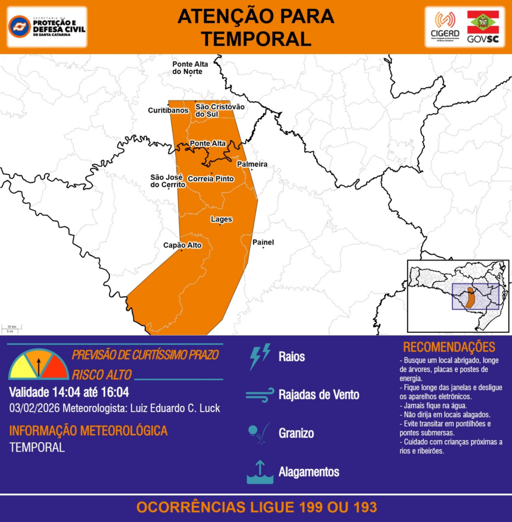 ATENÇÃO – 03/02 14:04 – TEMPORAL com RAIOS, RAJADAS DE VENTO, GRANIZO e ALAGAMENTOS para os municípios de Capão Alto, Correia Pinto, Curitibanos, Lages, Painel, Palmeira, Ponte Alta, Ponte Alta do Norte, São Cristóvão do Sul e São José do Cerrito nas próximas 2 horas. Ocorrências ligue 199 ou 193.