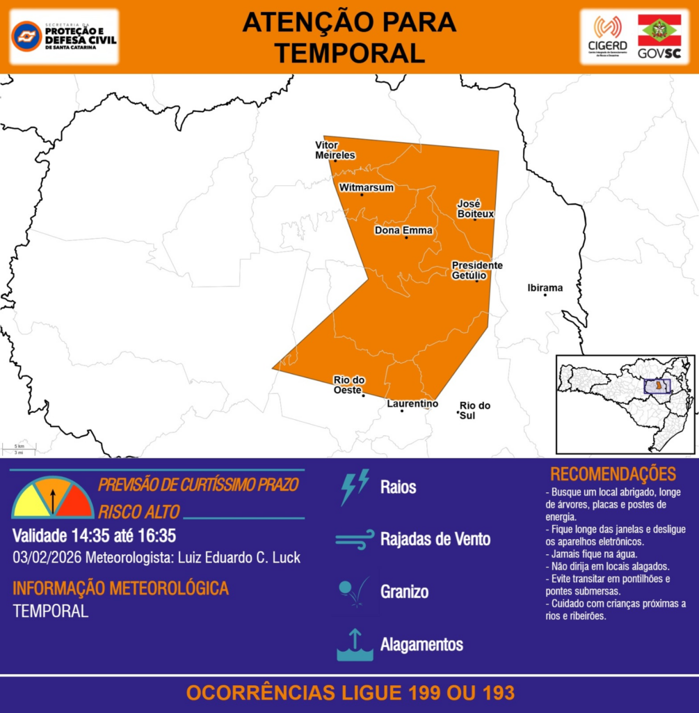 ATENÇÃO – 03/02 14:35 – TEMPORAL com RAIOS, RAJADAS DE VENTO, GRANIZO e ALAGAMENTOS para os municípios de Dona Emma, Ibirama, José Boiteux, Laurentino, Presidente Getúlio, Rio do Oeste, Rio do Sul, Vitor Meireles e Witmarsum nas próximas 2 horas. Ocorrências ligue 199 ou 193