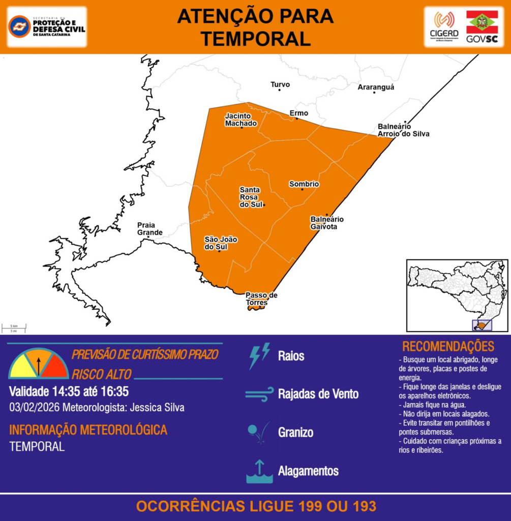 ATENÇÃO – 03/02 14:35 – TEMPORAL com RAIOS, RAJADAS DE VENTO, GRANIZO e ALAGAMENTOS para os municípios de Araranguá, Balneário Arroio do Silva, Balneário Gaivota, Ermo, Jacinto Machado, Passo de Torres, Praia Grande, Santa Rosa do Sul, Sombrio, São João do Sul e Turvo nas próximas 2 horas. Ocorrências ligue 199 ou 193.