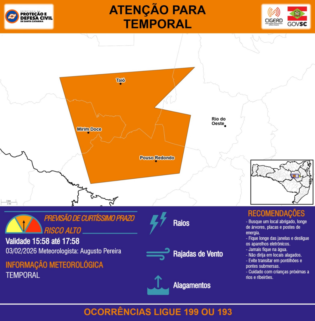 ATENÇÃO – 03/02 15:58 – TEMPORAL com RAIOS, RAJADAS DE VENTO e ALAGAMENTOS para os municípios de Mirim Doce, Pouso Redondo, Rio do Oeste e Taió nas próximas 2 horas. Ocorrências ligue 199 ou 193.