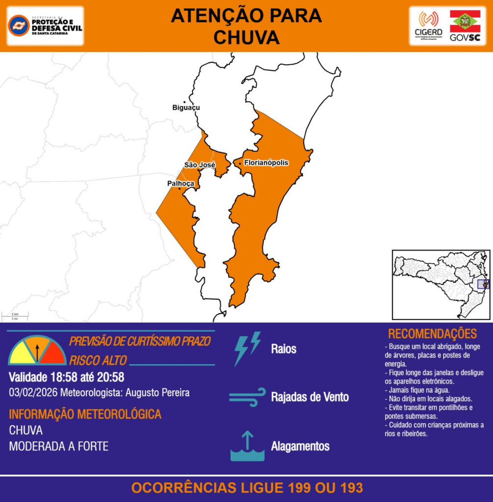 ATENÇÃO – 03/02 18:58 – CHUVA de intensidade moderada a forte com RAIOS, RAJADAS DE VENTO e ALAGAMENTOS para os municípios de Biguaçu, Florianópolis, Palhoça e São José nas próximas 2 horas. Ocorrências ligue 199 ou 193.