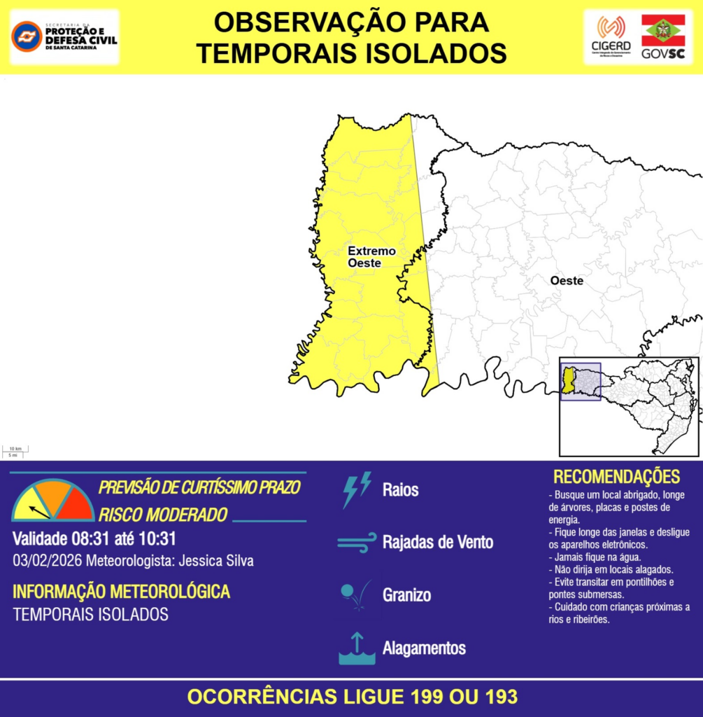 OBSERVAÇÃO – 03/02 08:31 – TEMPORAIS ISOLADOS com RAIOS, RAJADAS DE VENTO, GRANIZO e ALAGAMENTOS pontuais para as regiões do Extremo Oeste e Oeste nas próximas 2 horas. Ocorrências ligue 199 ou 193.