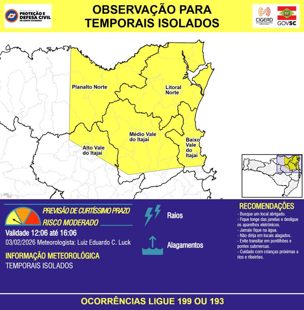 OBSERVAÇÃO – 03/02 12:06 – TEMPORAIS ISOLADOS com RAIOS e ALAGAMENTOS pontuais para as regiões do Planalto Norte, Litoral Norte, Baixo, Médio e Alto Vale do Itajaí nas próximas 4 horas. Ocorrências ligue 199 ou 193.