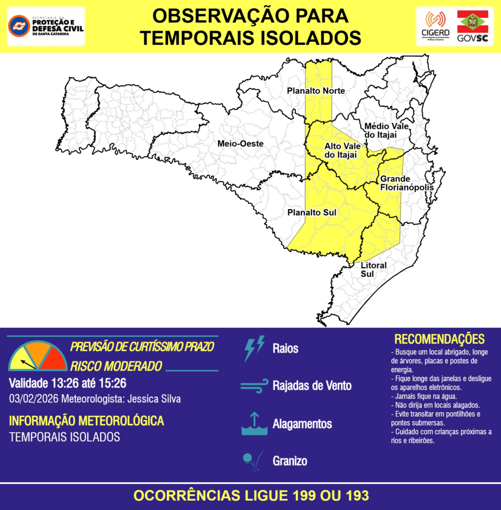 OBSERVAÇÃO – 03/02 13:26 – TEMPORAIS ISOLADOS com RAIOS, RAJADAS DE VENTO, GRANIZO e ALAGAMENTOS pontuais para as regiões do Meio-Oeste, Planalto Norte, Planalto Sul, Litoral Sul, Grande Florianópolis, Médio e Alto Vale do Itajaí nas próximas 2 horas. Ocorrências ligue 199 ou 193.