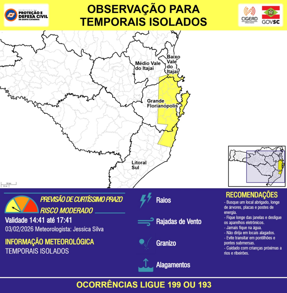 OBSERVAÇÃO – 03/02 14:41 – TEMPORAIS ISOLADOS com RAIOS, RAJADAS DE VENTO, GRANIZO e ALAGAMENTOS pontuais para as regiões do Litoral Sul, Grande Florianópolis, Baixo e Médio Vale do Itajaí nas próximas 3 horas. Ocorrências ligue 199 ou 193..