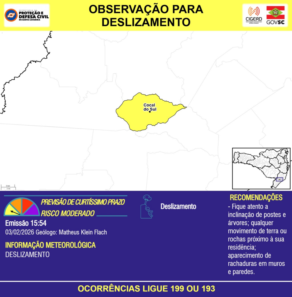 OBSERVAÇÃO – 03/02 15:54 – DESLIZAMENTO para o município de Cocal do Sul. Ocorrências ligue 199 ou 193.