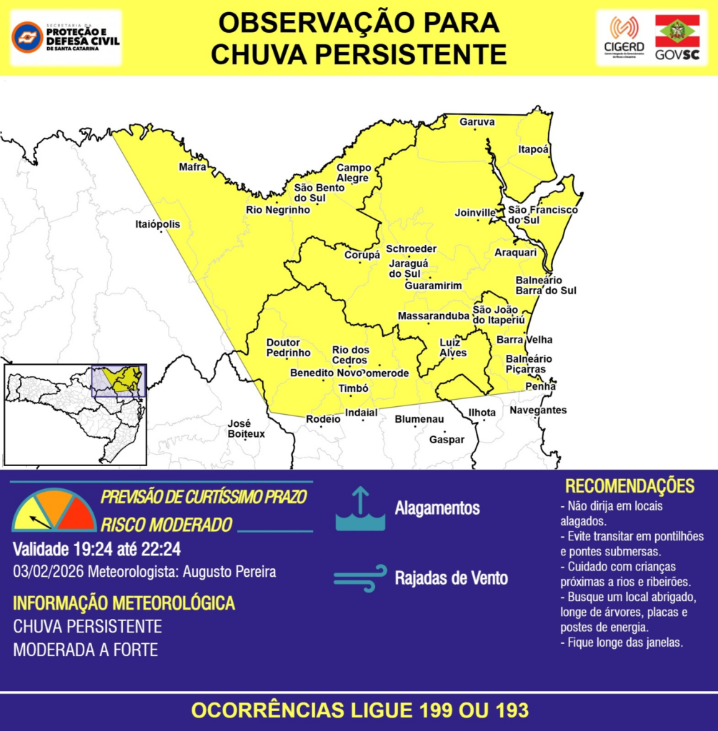 OBSERVAÇÃO – 03/02 19:23 – CHUVA PERSISTENTE de intensidade moderada a forte com RAJADAS DE VENTO e ALAGAMENTOS pontuais para as regiões do Planalto Norte, Litoral Norte, Baixo, Médio e Alto Vale do Itajaí nas próximas 3 horas. Ocorrências ligue 199 ou 193.