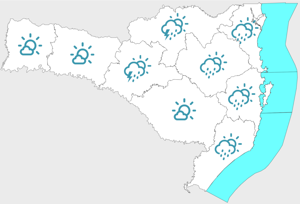 Sexta-feira (06) típica de verão em toda a SC, com presença de sol, muito calor e condições para pancadas isoladas de chuva acompanhadas por temporais, com raios, rajadas de vento e eventual granizo. O risco é baixo a pontualmente moderado para ocorrências relacionadas a alagamentos pontuais, queda de galhos e árvores e destelhamentos. No amanhecer, temperaturas mínimas entre 13°C e 18°C nas áreas serranas e de 19°C a 25°C nas demais regiões. À tarde, faz muito calor com máximas superando 30°C em todo o estado e se aproximando de 40°C no Grande Oeste. O risco relacionado ao forte calor é moderado a alto no estado.