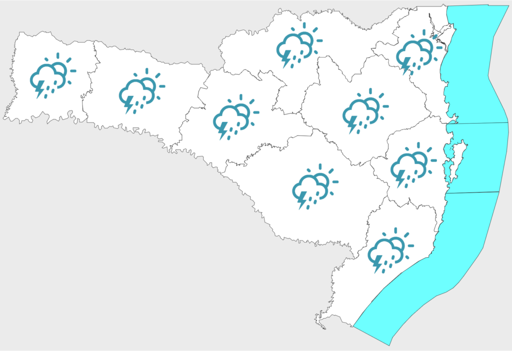 No sábado (07), a instabilidade volta a ganhar força em SC com o avanço de uma frente fria, que se desloca pelo mar associada a um sistema de baixa pressão entre SC e o PR. A chuva começa no decorrer da manhã a partir das áreas de divisa com o RS e se estende para as demais regiões entre a tarde e a noite, quando são esperados volumes significativos de chuva, sobretudo na porção central do estado e no Litoral Norte. O risco é moderado a alto para ocorrências relacionadas a alagamentos, enxurradas, queda de galhos e árvores e destelhamentos. O vento varia de sul a sudeste e com intensidade fraca a moderada. As temperaturas máximas seguem altas e se aproximam dos 30°C em todas as regiões, com sensação de ar abafado. O risco relacionado ao forte calor é moderado a pontualmente alto no estado.