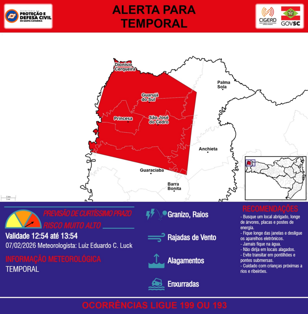 ALERTA – 07/02 12:54 – TEMPORAL com RAJADAS DE VENTO, ALAGAMENTOS, GRANIZO, RAIOS e risco de ENXURRADAS para os municípios de Anchieta, Barra Bonita, Dionísio Cerqueira, Guaraciaba, Guarujá do Sul, Palma Sola, Princesa e São José do Cedro na próxima hora. Ocorrências ligue 199 ou 193.