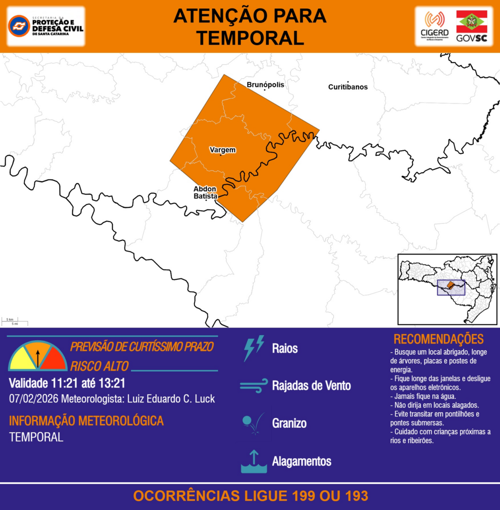 ATENÇÃO – 07/02 11:21 – TEMPORAL com RAIOS, RAJADAS DE VENTO, GRANIZO e ALAGAMENTOS para os municípios de Abdon Batista, Brunópolis, Curitibanos e Vargem nas próximas 2 horas. Ocorrências ligue 199 ou 193.