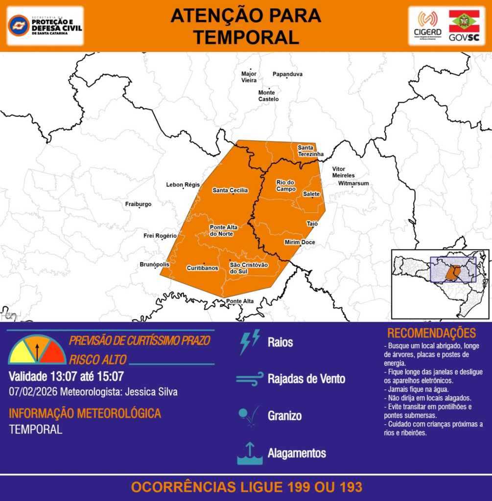 ATENÇÃO – 07/02 13:07 – TEMPORAL com RAIOS, RAJADAS DE VENTO, GRANIZO e ALAGAMENTOS para os municípios de Brunópolis, Curitibanos, Fraiburgo, Frei Rogério, Lebon Régis, Major Vieira, Mirim Doce, Monte Castelo, Papanduva, Ponte Alta, Ponte Alta do Norte, Rio do Campo, Salete, Santa Cecília, Santa Terezinha, São Cristóvão do Sul, Taió, Vitor Meireles e Witmarsum nas próximas 2 horas. Ocorrências ligue 199 ou 193.